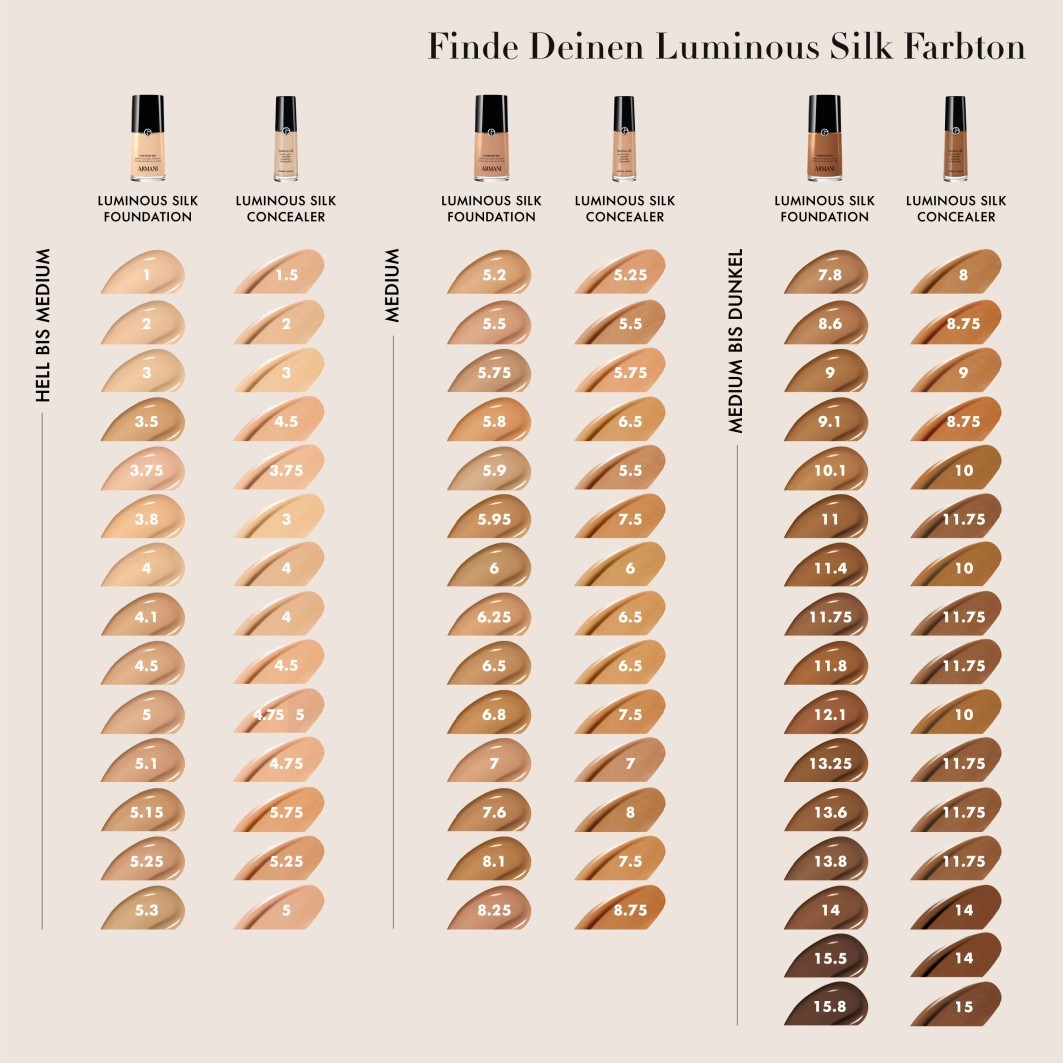 Art-Nr.1256113Farbe4.5DeckkraftmittelKonsistenzflüssigHauttypAlle HauttypenFinishstrahlendEigenschaftleuchtend, schimmernd, kaschierendNachfüllbare Variante verfügbarNeinNachfüll-Variante verfügbarNeinWasserfestNeinProdukttypFlascheAnwendungsbereichGesichtAlterAlle AltersgruppenArmani Luminous Silk Foundation: für makellose Make-up-Looks