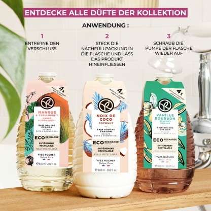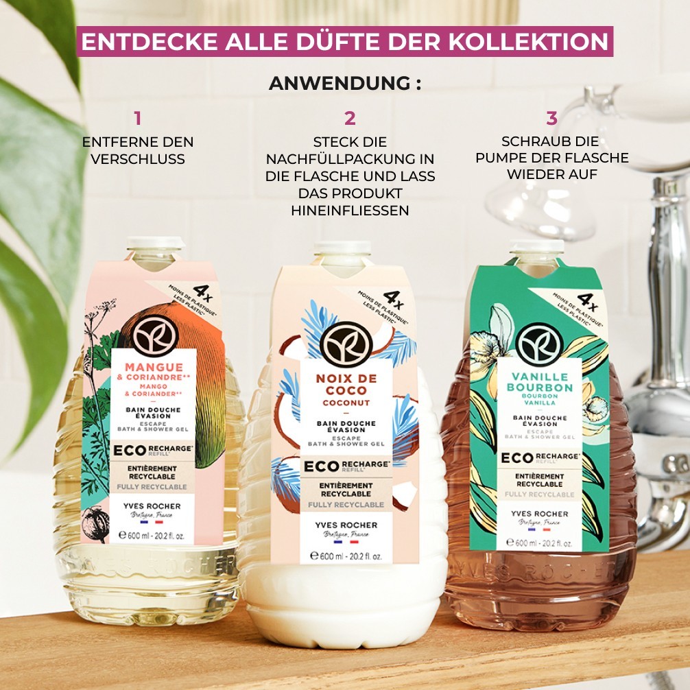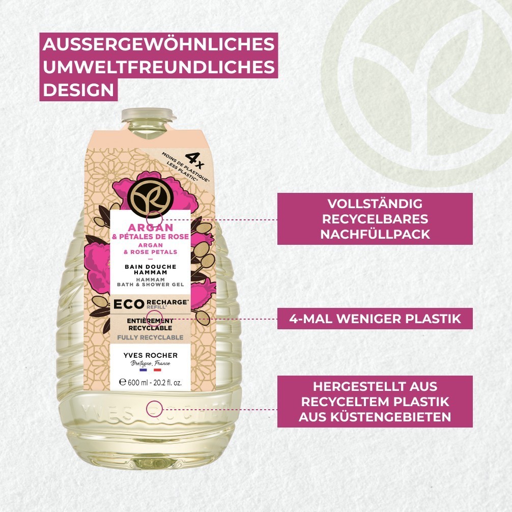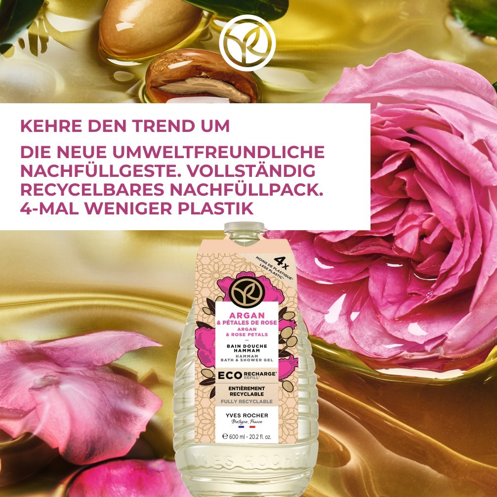 Das legendäre Duschbad Hammam Arganöl & Rosenblüten von Yves Rocher präsentiert sich in einer Nachfüllpackung aus zu mindestens 90 Prozent aus dem von Küsten stammenden recycelten Kunststoff – so wird das Reduzieren von Plastikmüll einfach gemacht! Das mit 93 Prozent natürlichen Inhaltsstoffen angereicherte Duschgel verwandelt sich bei Kontakt mit Wasser in einen reichhaltigen Schaum, der die Haut bei der sanften Reinigung vor dem Austrocknen bewahrt, ihren natürlichen pH-Wert respektiert und mit Bio-Rose und biozertifiziertem Arganöl zart parfümiert. So vereint die Formel die entspannende Wirkung eines traditionellen Hammams mit einem berauschend orientalischen Duft.